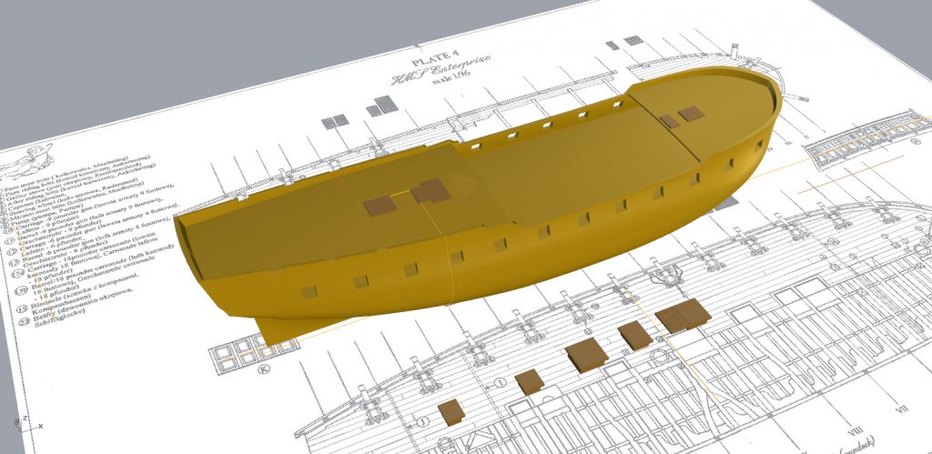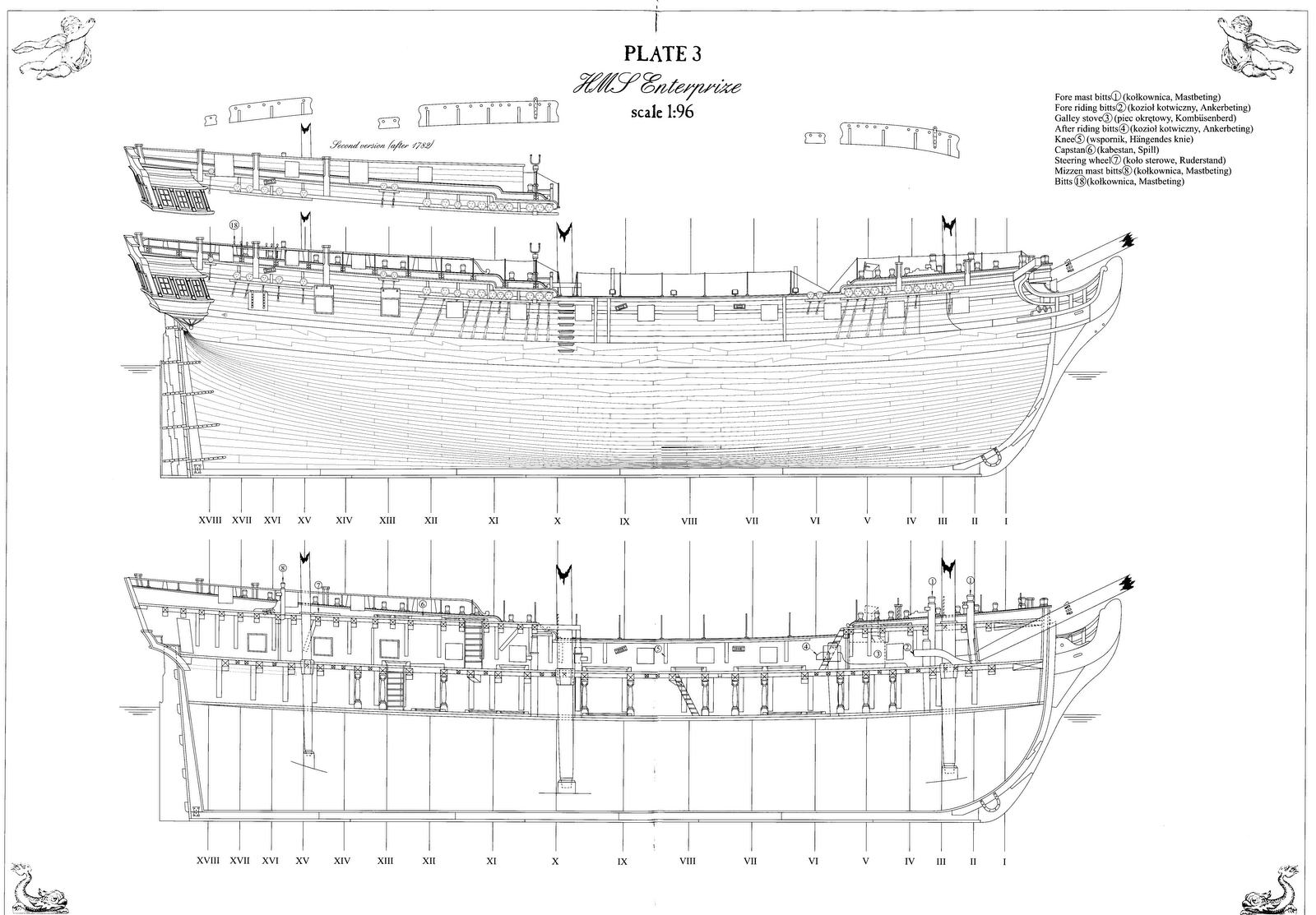 On completion, HMS Enterprise was a ship of 593 tons. She was 120’6″ long on her gundeck 3672.8 cm and was 33’6″ wide across her beam 1021.1 cm.