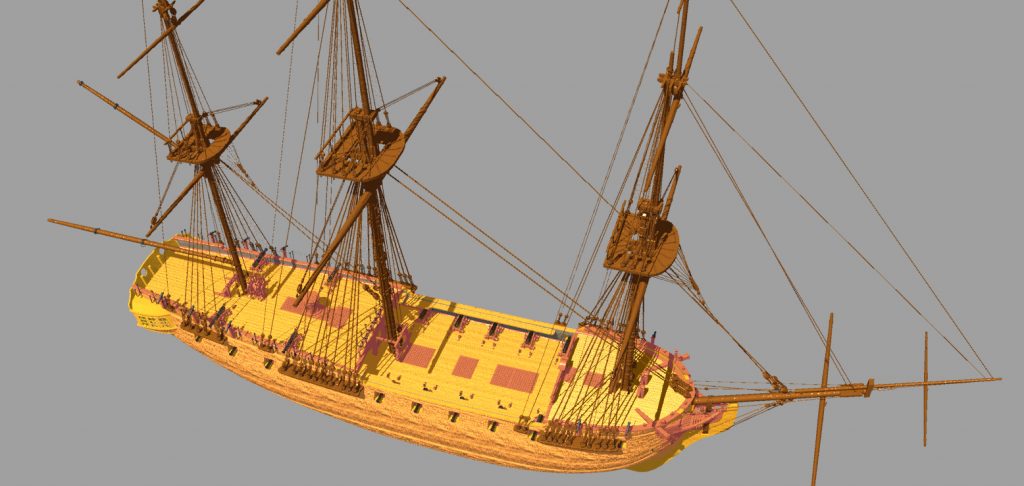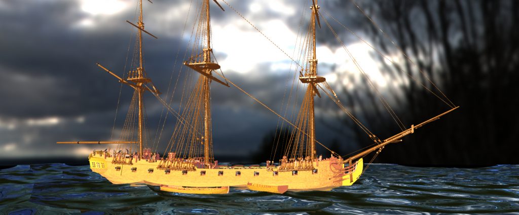 She was armed with 24 9pdr long guns on her gundeck, 4 3pdr long guns on her quarterdeck and was also fitted with 12 half-pound swivel guns dotted around her upper deck.
